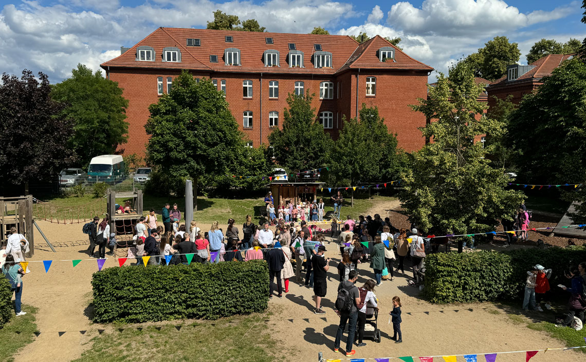 Die Potsdamer Kita Farbenspiel im Stadtteil Bornstedt feiert in diesem Jahr ihren 10. Geburtstag. Sie öffnete am 3. Februar 2014 ihre Türen, 137 Kinder ab 3 Monaten werden hier seitdem unter der Leitung von Angelika Stielow betreut. Die Kita arbeitet nach den Grundsätzen der Reggio-Pädagogik, hat eine hauseigene Küche und einen großen Garten.