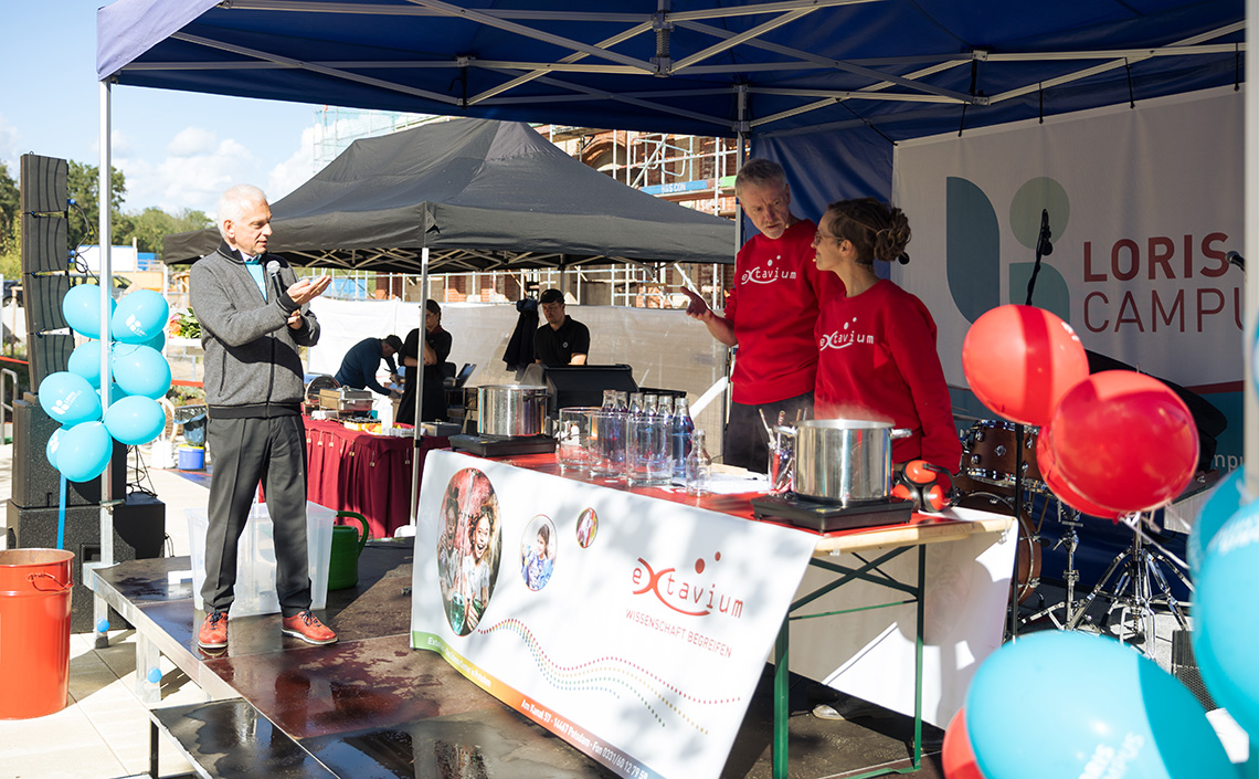 Am Nachmittag fand dann von 14 – 17 Uhr ein großes Familienfest zur Campuseröffnung auf dem Marktplatz vor der Kita statt. Mit dabei waren die Band Purfürst & Wein und das Extavium mit einer Science Show. Unterstützt wurde das Fest von Tobias Exner, Inhaber der Bäckerei Exner und Holger Exner von Kochgenuss & Feinkost Beelitz. Während des Festes gab es Führungen durch Kita und Schule/Hort im Interimsgebäude.