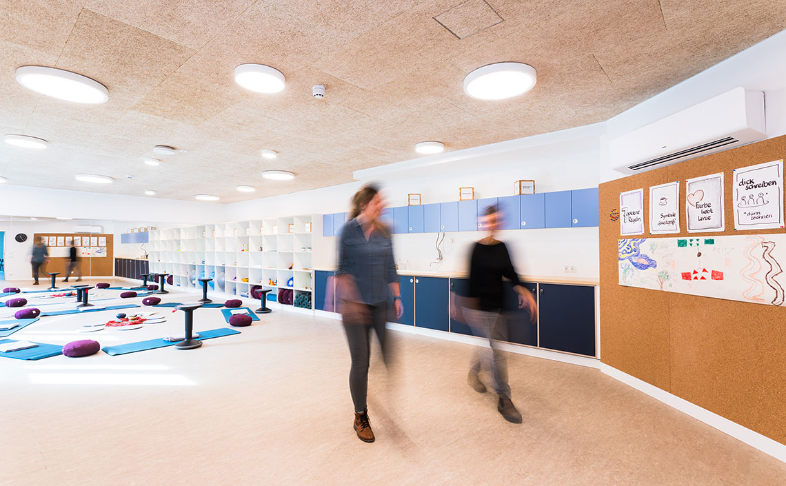 Ein Highlight der neuen Räume ist die Lernwerkstatt, die auf über 68 m² zum Entdecken, Experimentieren und Kreativsein einlädt. Mit offenen Regalsystemen, einer Kork- und einer Spiegelwand sowie einer „Nass-Zeile" für künstlerische Aktivitäten eine Umgebung, die das Lernen mit allen Sinnen ermöglicht. Neu hinzugekommen sind die zwei Beratungsräume „Ideenschmiede“ und „Begegnungsort“. Diese bieten einen Raum für vertrauensvolle und ruhige Gespräche, laden zum Wohlfühlen und zum gemeinsamen Gedankenaustausch ein.